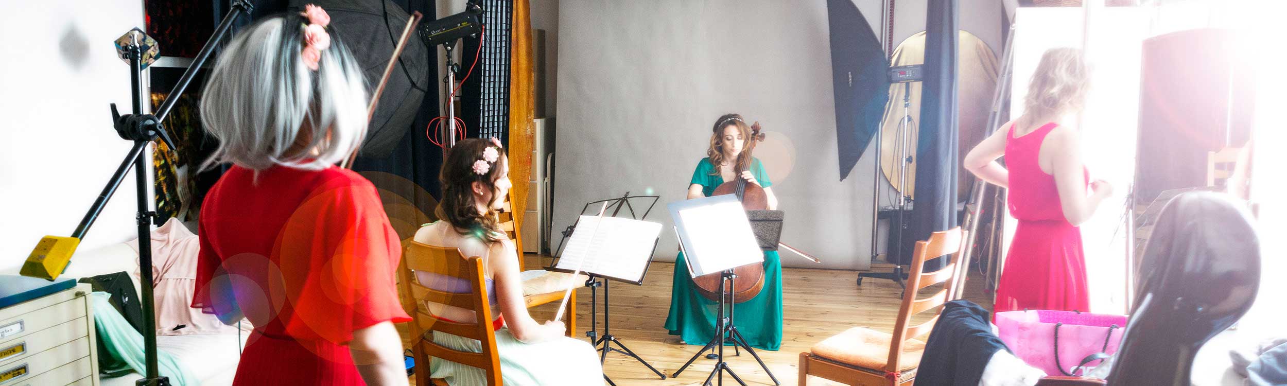 2 Hintergrundsysteme auf Rollen: 2,75 und 3,6 m mit verschiedenen Hintergründen